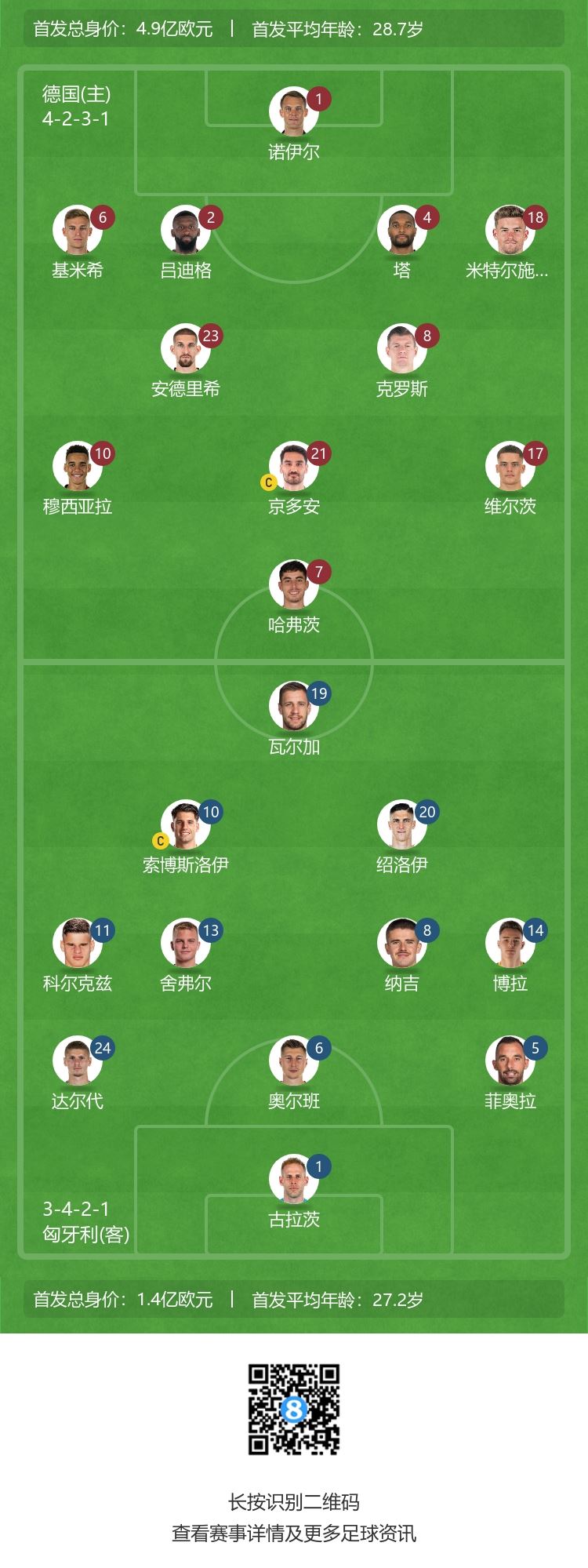 北京时间6月20日0点,欧洲杯小组赛A组第2轮,东道主德国vs匈牙利的比赛将在斯图加特竞技场打响。赛前双方首发阵容出炉。