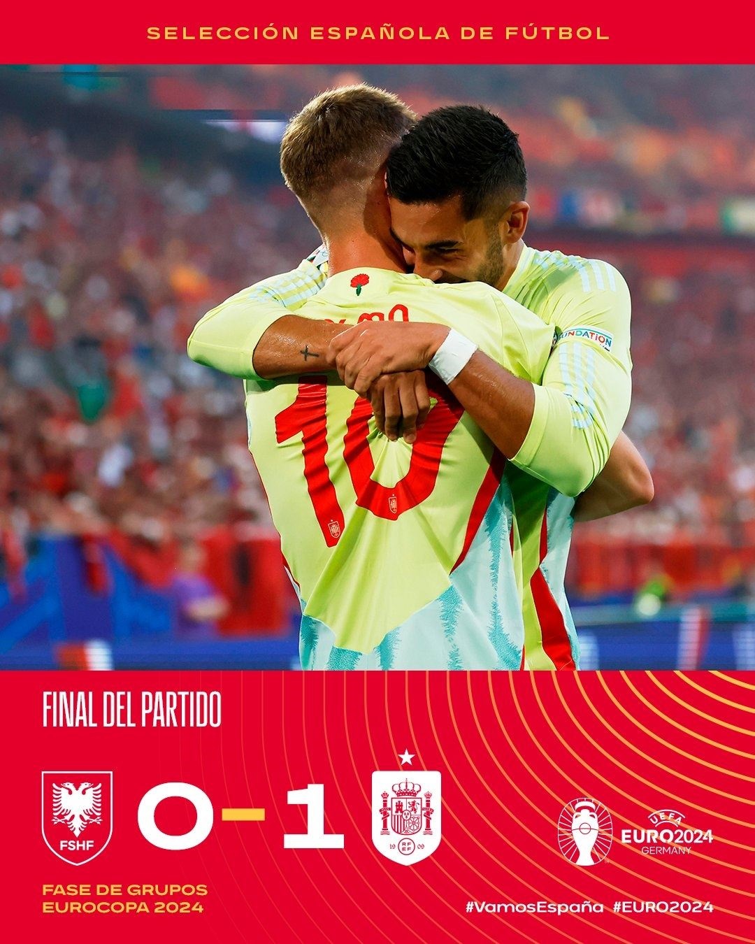 欧洲杯小组赛B组第3轮,西班牙1-0阿尔巴尼亚,小组赛全胜头名出线,奥尔莫助攻费兰-托雷斯破门;阿尔巴尼亚积1分小组垫底。