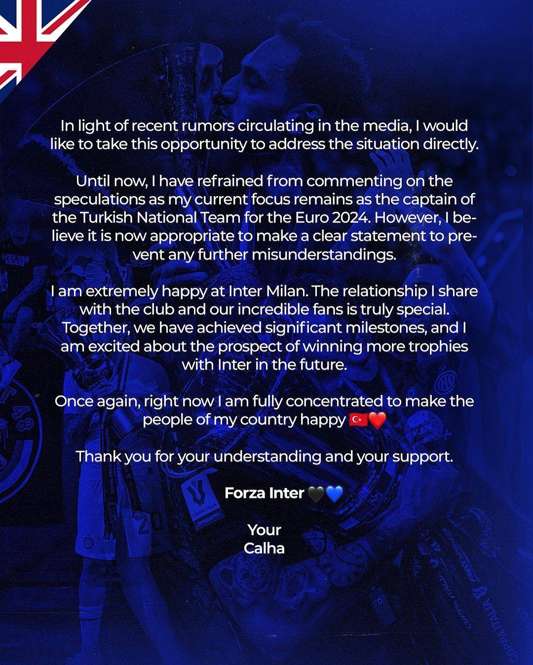 恰尔汗奥卢近期与拜仁联系在一起,球员本人在社媒发布声明辟谣相关消息。