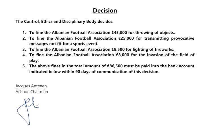 欧足联本届欧洲杯第三次对阿尔巴尼亚开出罚单,由于球迷在对西班牙的比赛中的不当行为,处以8.65万欧罚款。