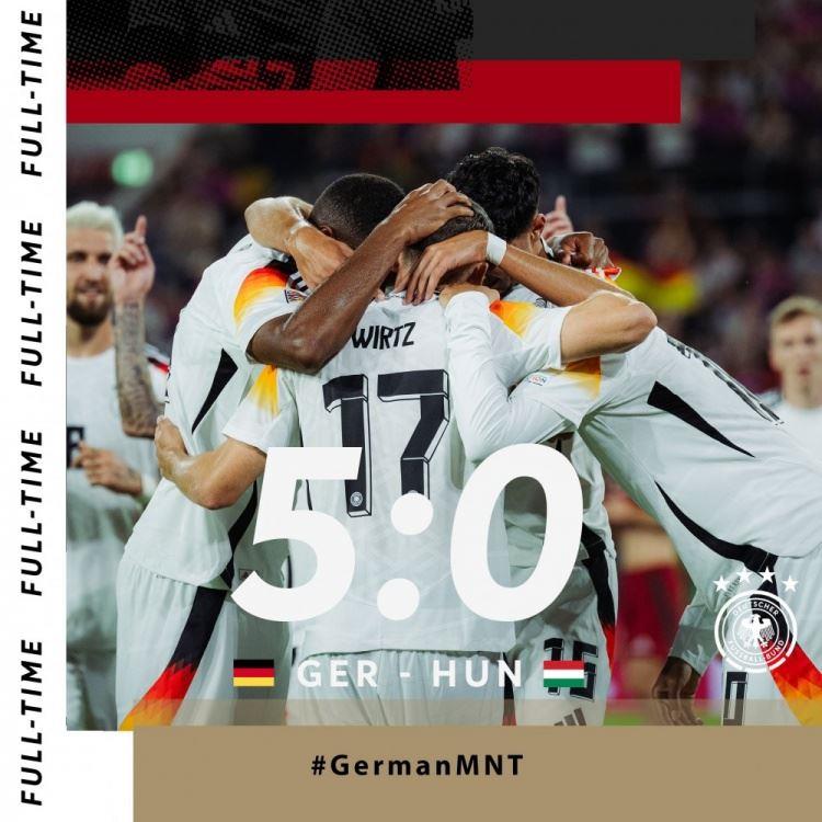 欧国联A级比赛,德国5-0大胜匈牙利,穆西亚拉1射3传,维尔茨传射。