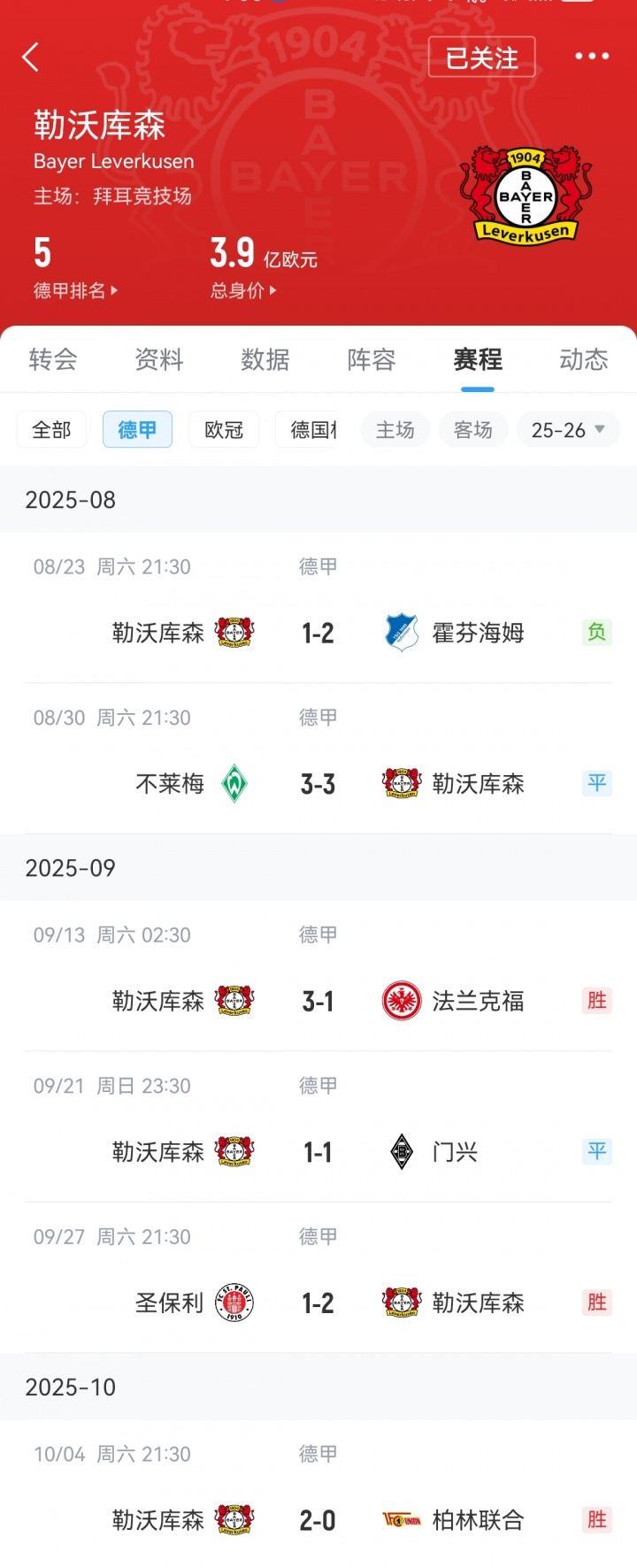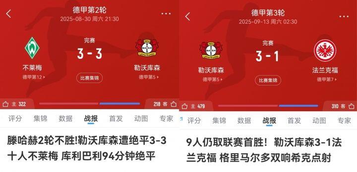 勒沃库森2-0柏林联合,近4轮3胜1平,球队在开局1平1负解雇主帅滕哈赫后,目前已经来到了德甲第五的位置。