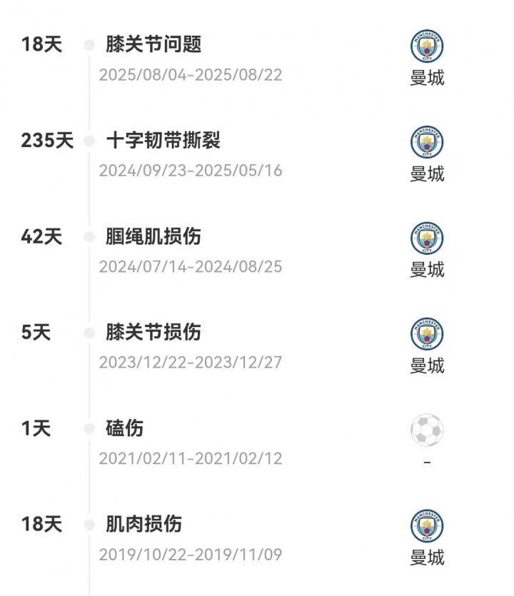 2024/25赛季初,罗德里遭遇膝盖前十字韧带撕裂(ACL)的重伤,休战235天。以金球先生的受伤为转折点,曼城褪去了“七年六冠”时期的光环,提前进入了重建期。