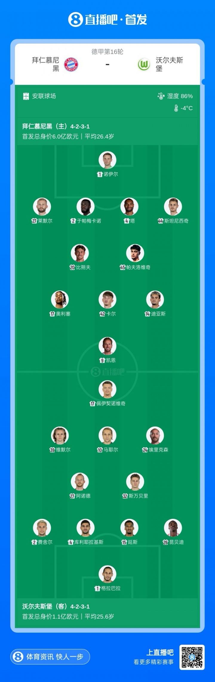 德甲第16轮,拜仁慕尼黑主场迎战沃尔夫斯堡,赛前首发名单公布。