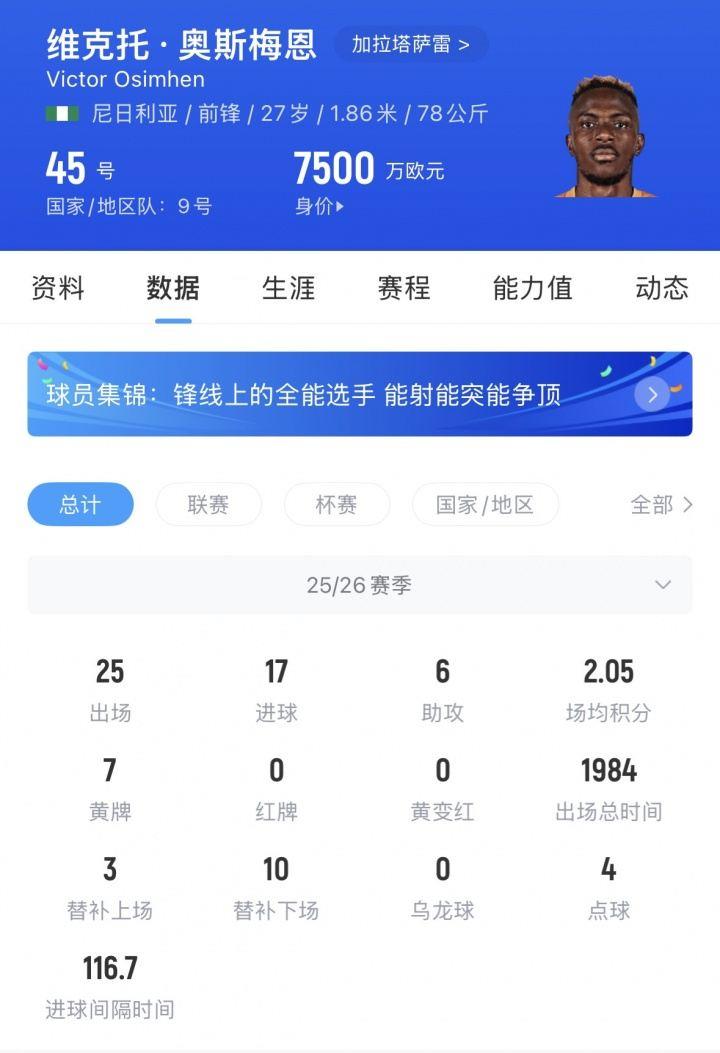 奥斯梅恩现年27岁,他本赛季25场17球6助,身价7500万欧,与加拉塔萨雷的合同至2029年。
