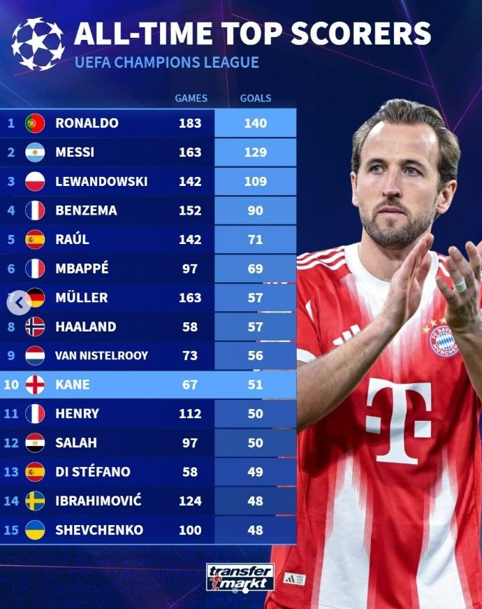 搜体育 足球资讯 凯恩生涯67场欧冠进51球,相同场次进球数仅次于范尼,与梅西相同