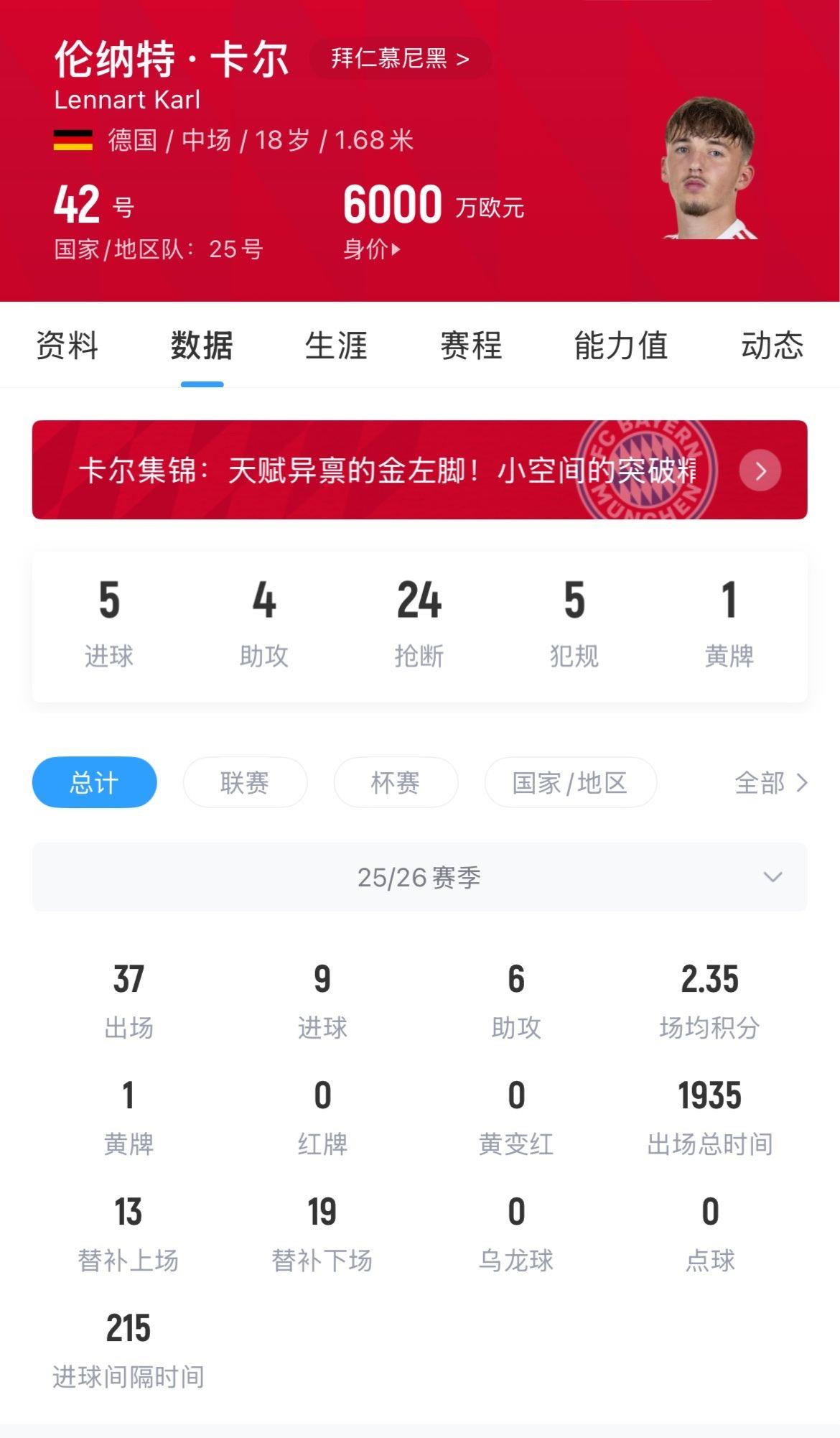 18岁的德国中场卡尔本赛季代表贡献9粒进球和6次助攻,4月16日凌晨3点,拜仁将在欧冠1/4决赛次回合中主场迎战皇马。