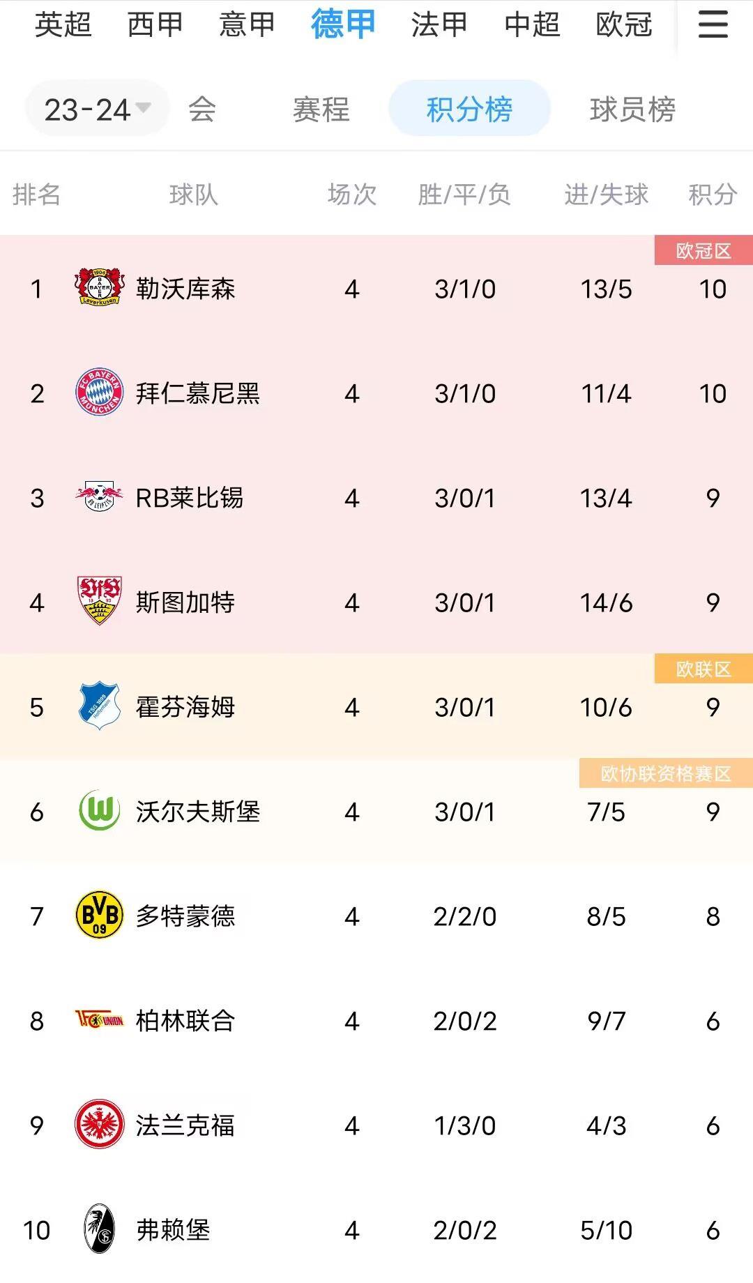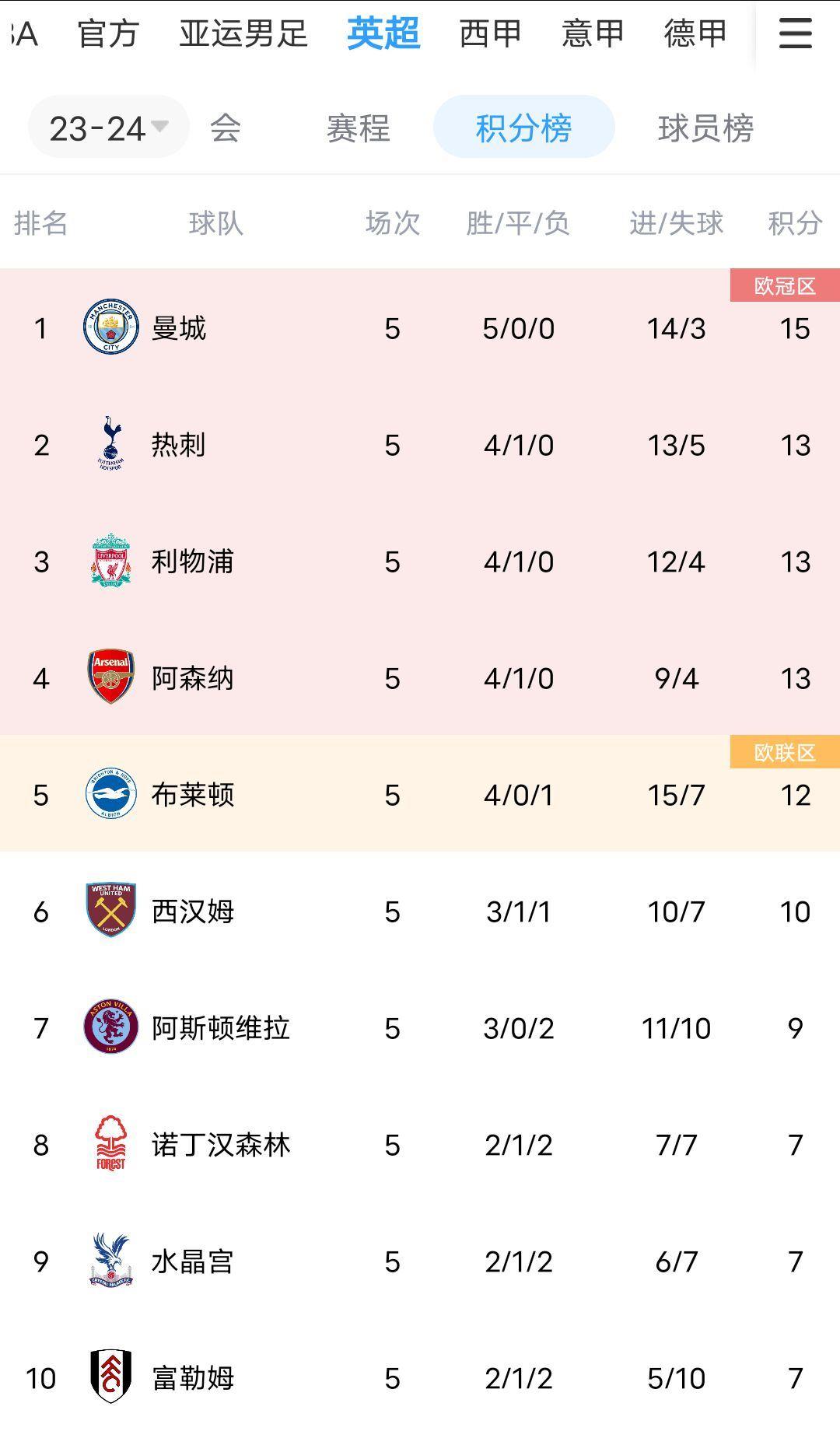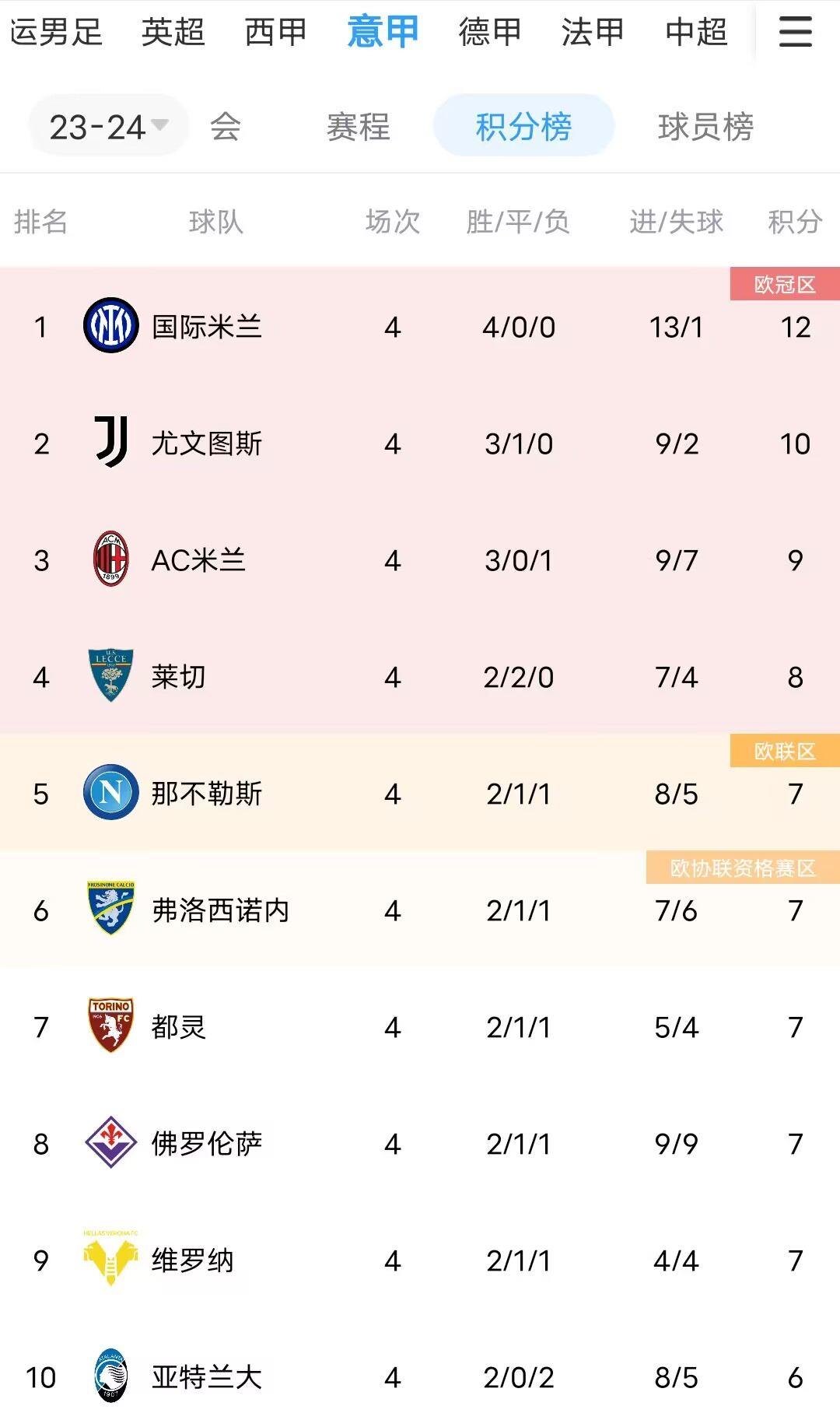 各联赛排名情况(除英超外,其余联赛只截取前十)↓