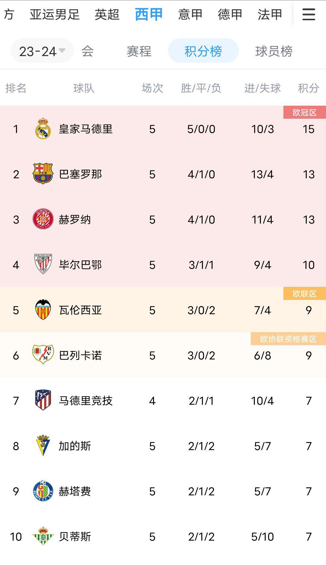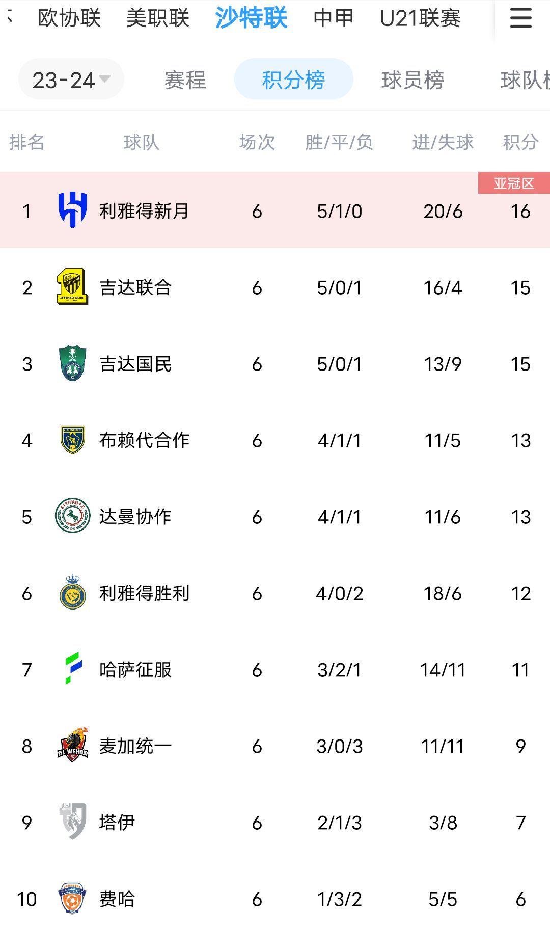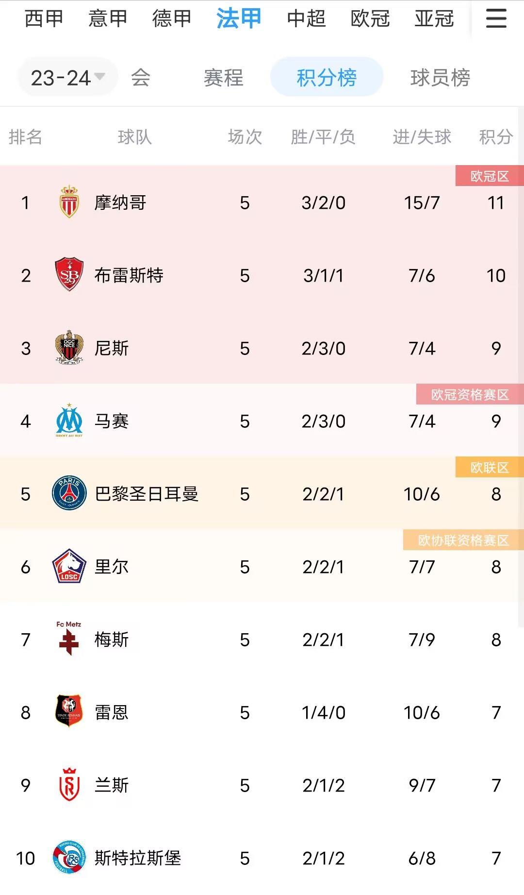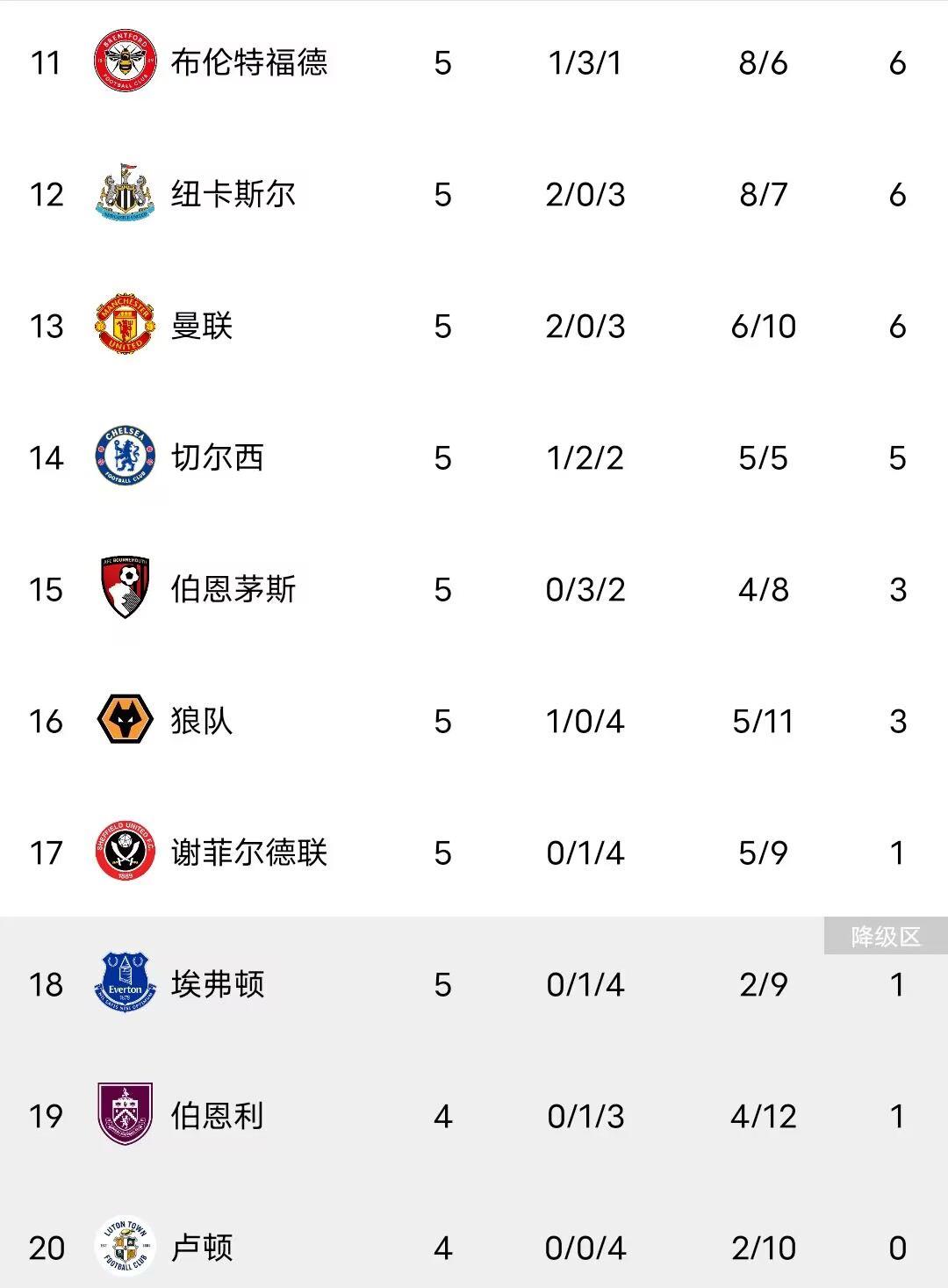 各联赛排名情况(除英超外,其余联赛只截取前十)↓