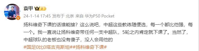 袁甲在个人微博写道:“扬科维奇下课的话谁能接?这么说吧,中超这些教练随便选,每一个都比他强,每一个。我一直说让扬科维奇带任何一支中超队,5轮之内肯定就下课了。当然了,中超球队的老板也没有傻子,没人会用他的”