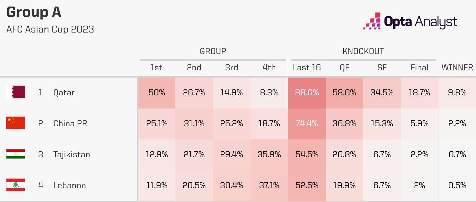 Opta亚洲杯开赛前给出的A组各阶段模拟概率