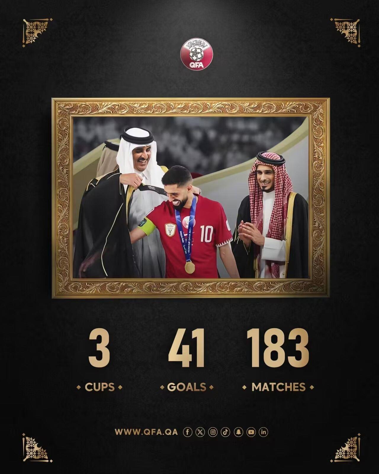 33岁的海多斯为卡塔尔出战183场比赛,贡献41球,并帮助卡塔尔在2019、2023亚洲杯上实现两连冠。
