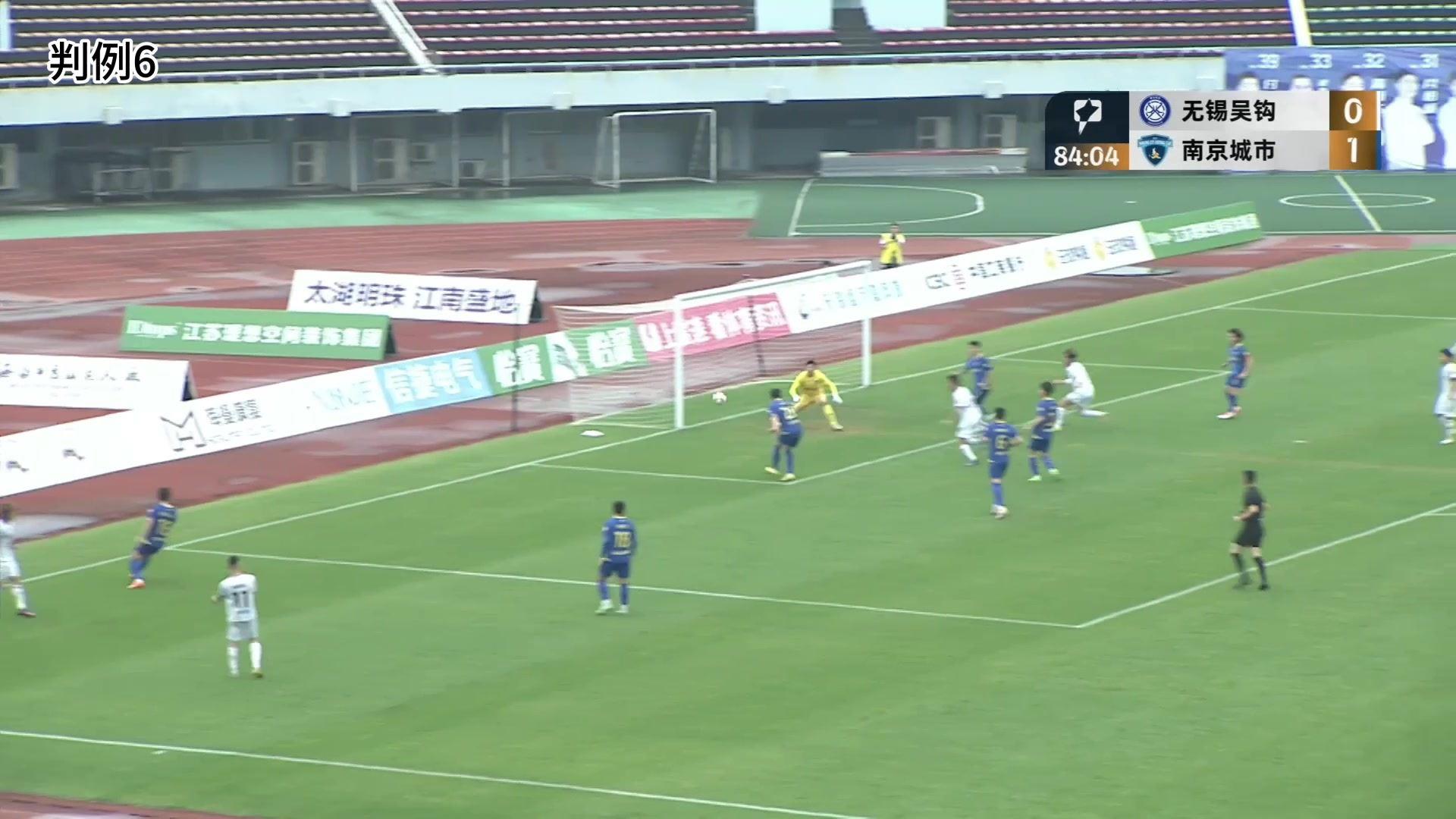 判例六:中甲联赛第8轮无锡吴钩VS南京城市,比赛第85分钟,无锡吴钩队进攻时将球传中至南京城市队罚球区内,无锡队19号队员将球顶向对方球门,无锡队18号队员与对方队员争抢后,球进入球门,裁判员判进球有效。