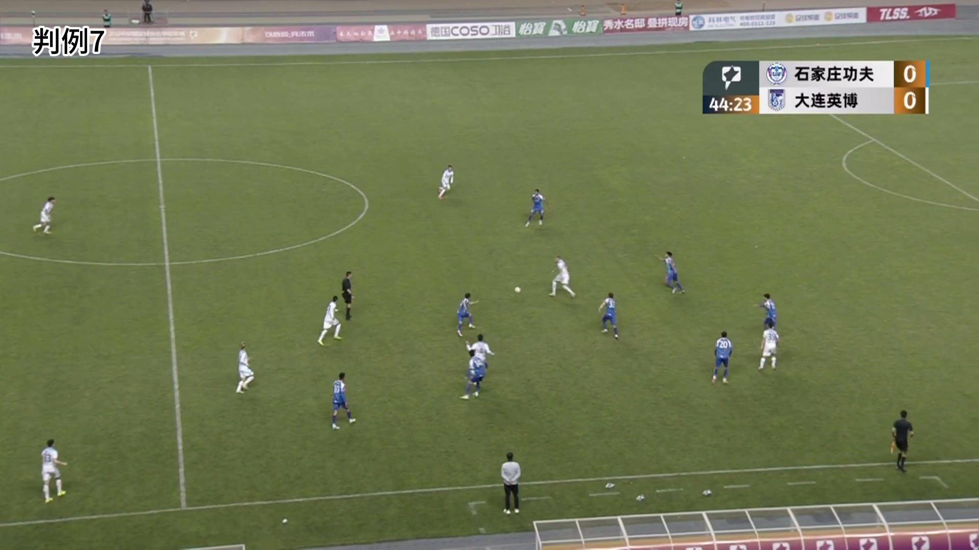 视频七:中甲联赛第8轮石家庄功夫VS大连英博,比赛第45分钟,大连英博队29号队员带球进入对方罚球区内射门,球被石家庄功夫队守门员扑救反弹后,石家庄功夫队25号队员手臂与球有接触,裁判员判罚不是手球犯规,比赛继续。