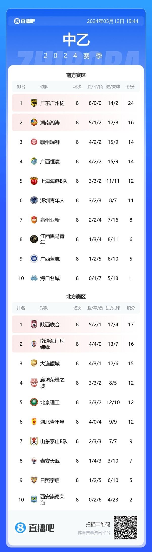 中乙第8轮今天结束争夺,湖南湘涛2-1逆转取胜收获4连胜,升至南区次席,泰山B队0-1输球。