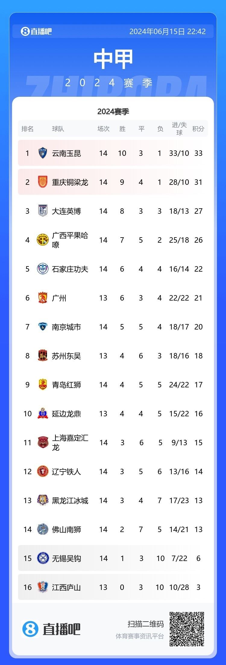 今天进行了中甲第14轮6场比赛,云南玉昆客场3-0击败大连英博,继续领跑积分榜;重庆铜梁龙主场3-1击败无锡吴钩,在积分榜继续位居次席。