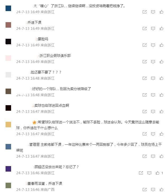 在中超联赛第19轮中,浙江队客场2-5负于青岛西海岸。虽然青岛西海岸是此前排在积分榜末位的球队,但浙江队在面对这样的对手时状态低迷,全队出现了多次失误,最后得到一场惨败。比赛结束后,愤怒的浙江球迷在球队官方微博评论区表达着不满。