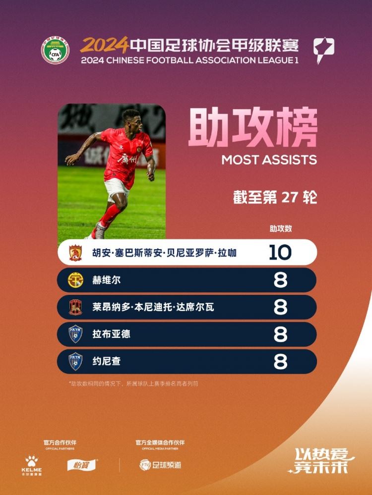 助攻榜方面,此前遭到“禁足”处罚的汪嵩已经被逐出榜单,另一名国产球员杨贺近期也渐渐跌出前五位。截至目前,广州队外援贝尼亚罗萨以10个助攻领跑该榜,身后的赫维尔、莱昂纳多、拉布亚德和约尼查的助攻数都为8个。
