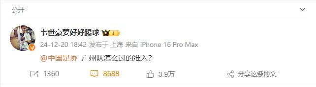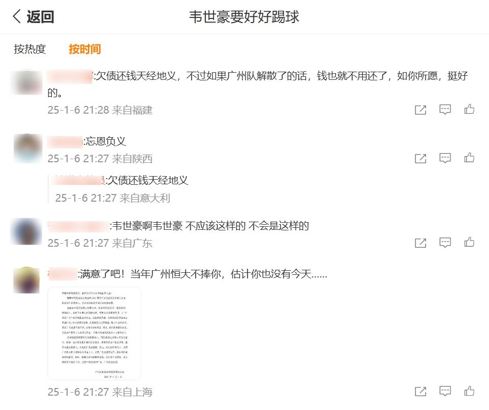 今日广州队官方发布公告,称无法继续征战中国职业足球联赛。此消息一出,有部分广州队球迷涌入韦世豪社媒下,对其进行攻击。