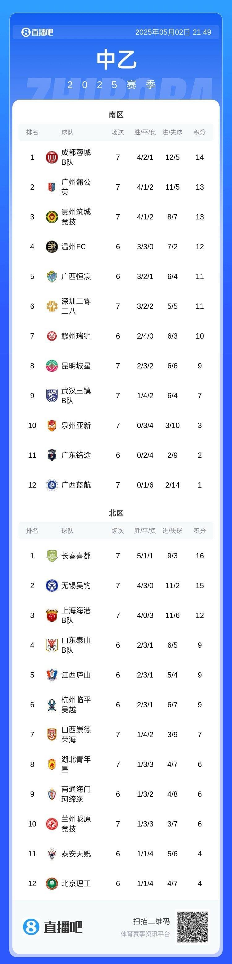 中乙第7轮今天展开7场较量,蓉城B队大胜泉州亚新暂登顶南区,三镇B队、海港B队均取胜。