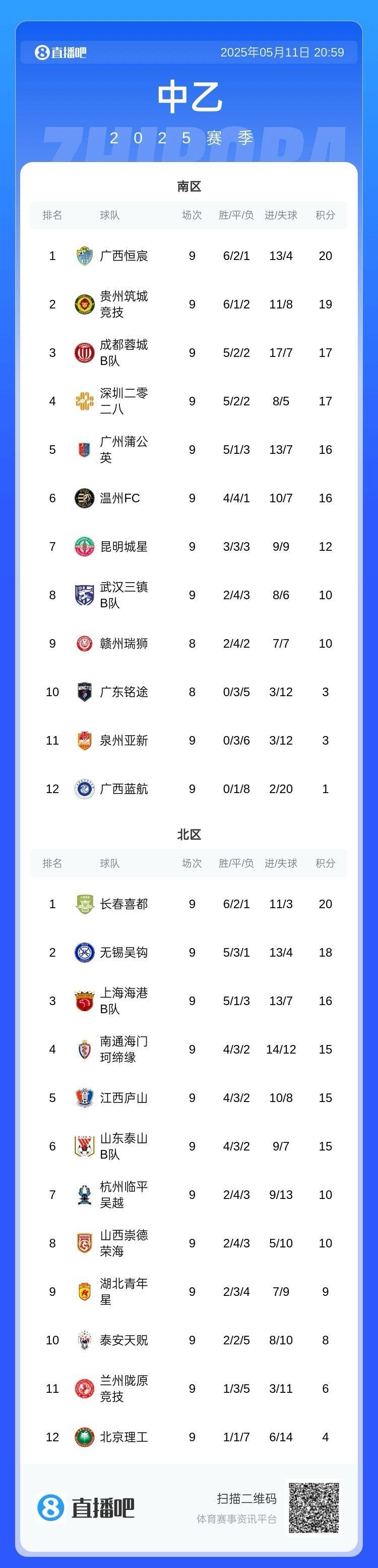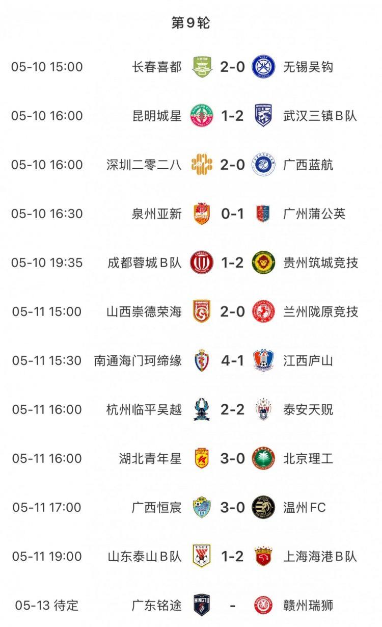 中乙第9轮结束11场比赛的争夺,海港B队客场2-1击败泰山B队,蓉城B队输球、三镇B队取胜,广东铭途vs赣州瑞狮的比赛将于5月13日16点进行。积分榜上,广西恒宸领跑南区,长春喜都领跑北区。