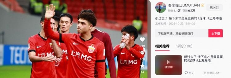 亚冠精英联赛第三轮,上海海港主场0-2不敌町田泽维亚。赛后,海港球员吾米提江更新了个人社交媒体。