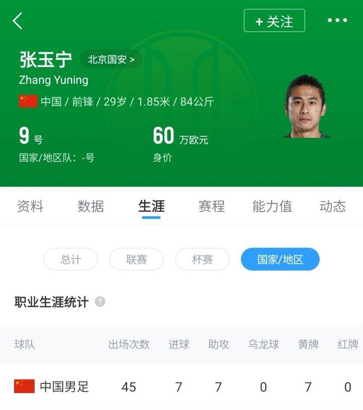 张玉宁2016年6月首次代表国足出战。至今代表国足出场45次,打进7球送出7次助攻。