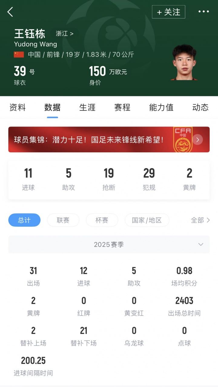 王钰栋现年19岁,身价150万欧,上赛季代表浙江出战31场,贡献12球5助攻,是中超的本土射手王。年初的U23亚洲杯上,王钰栋随中国队夺得亚军,创造参赛最好成绩。