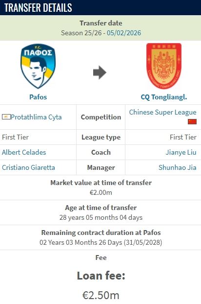 重庆铜梁龙官方宣布,帕福斯边锋迪马塔租借加盟球队,租期一年。