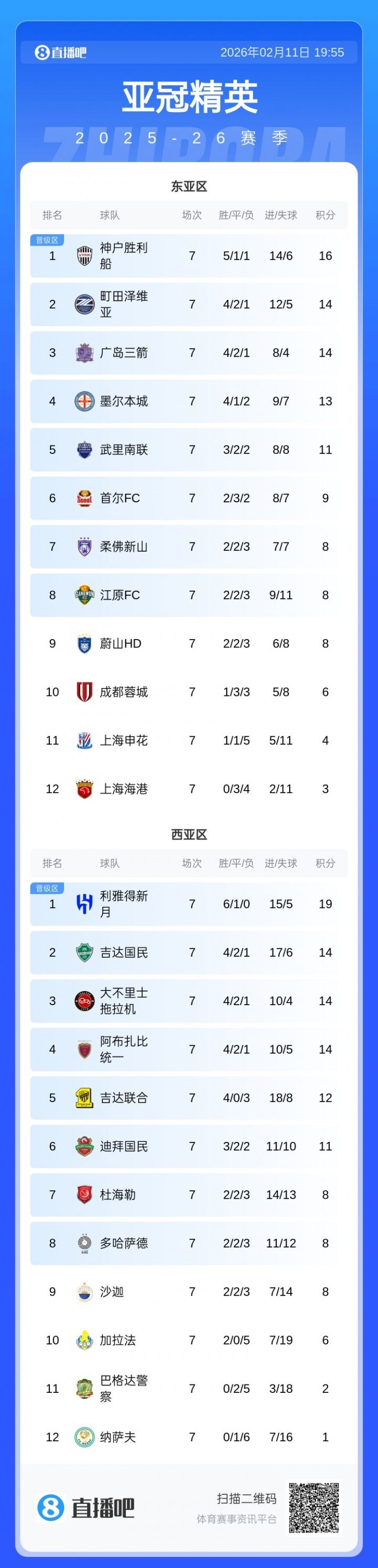 亚冠精英联赛东亚区第7轮结束,上海申花0-2町田泽维亚、成都蓉城0-1武里南联、上海海港0-0江原FC。