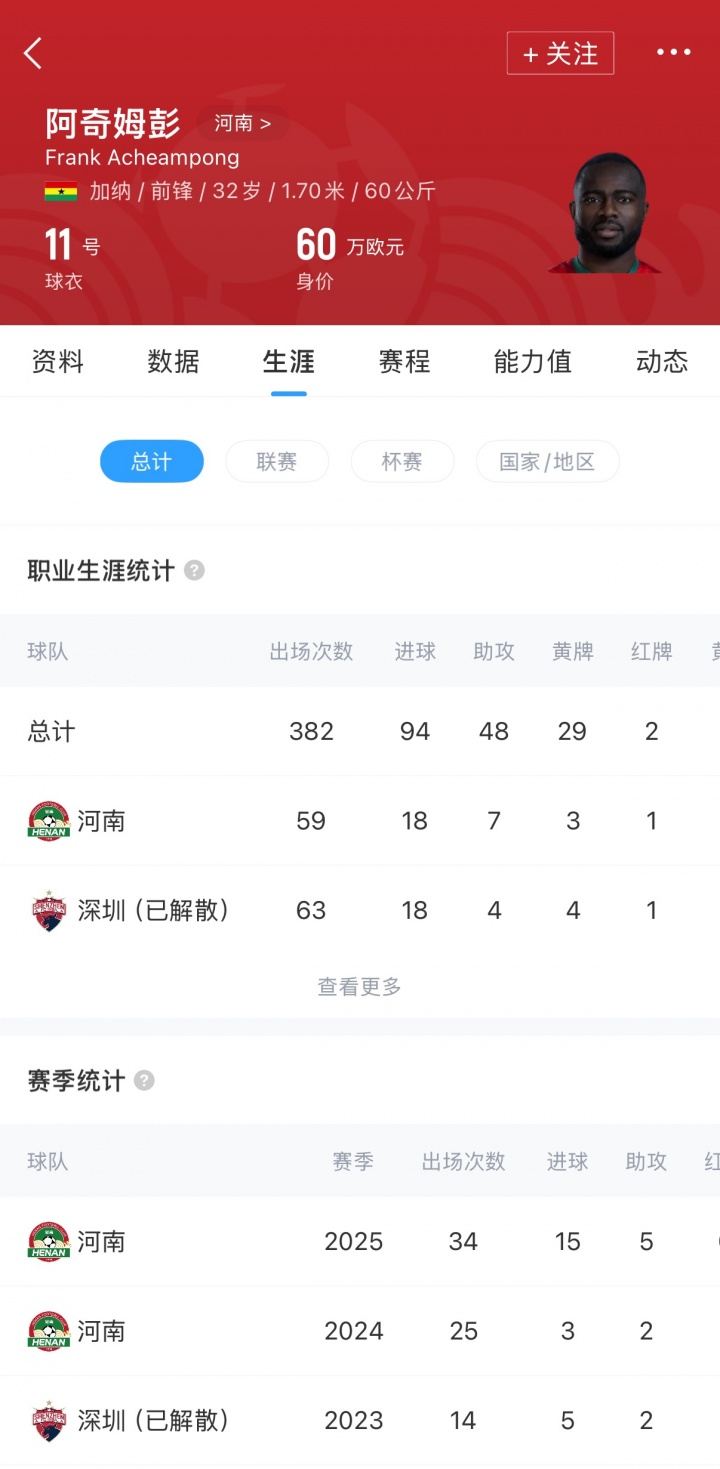 阿奇姆彭现年32岁,司职前锋,过去两个赛季效力于河南队,在河南效力期间,阿奇姆彭各赛事总计出场59次,贡献18球7助。阿奇姆彭与河南合同到期后目前为自由身。