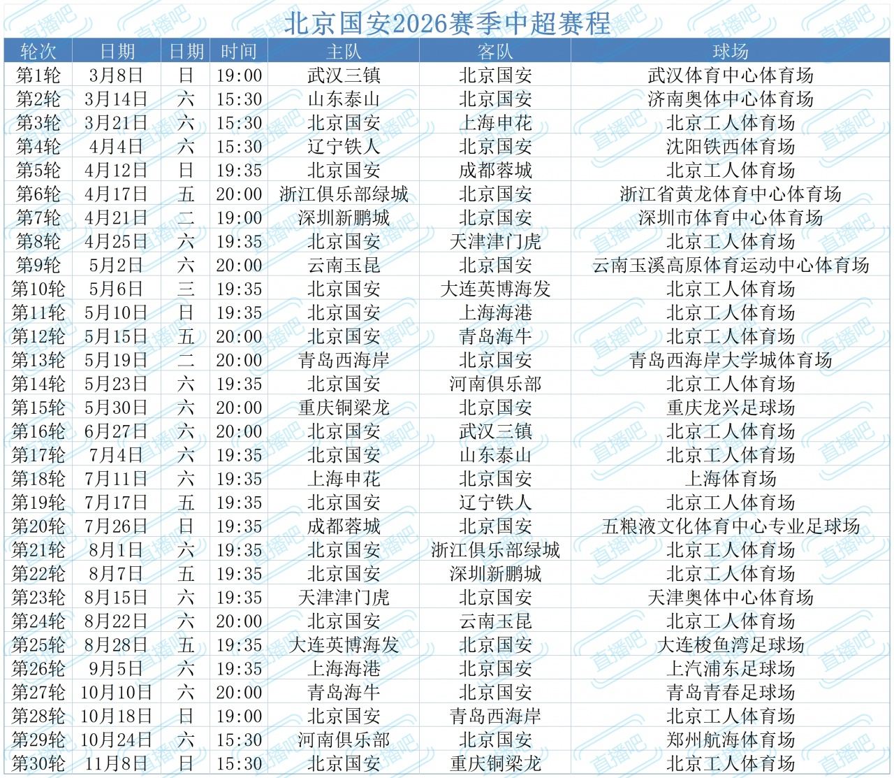 北京国安2026赛季中超赛程