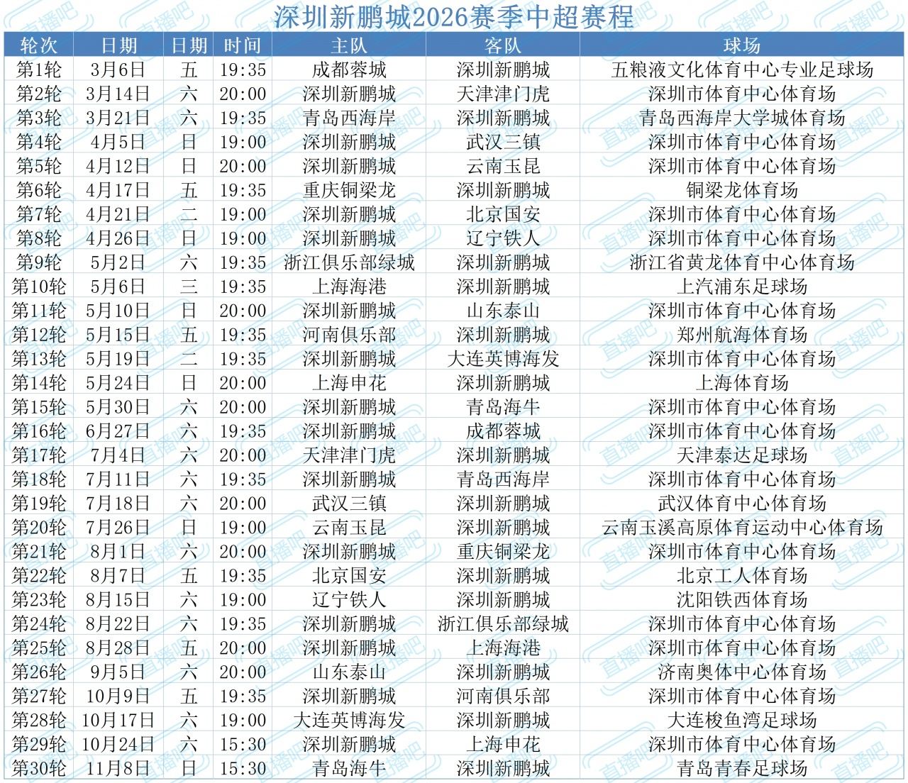 深圳新鹏城2026赛季中超赛程