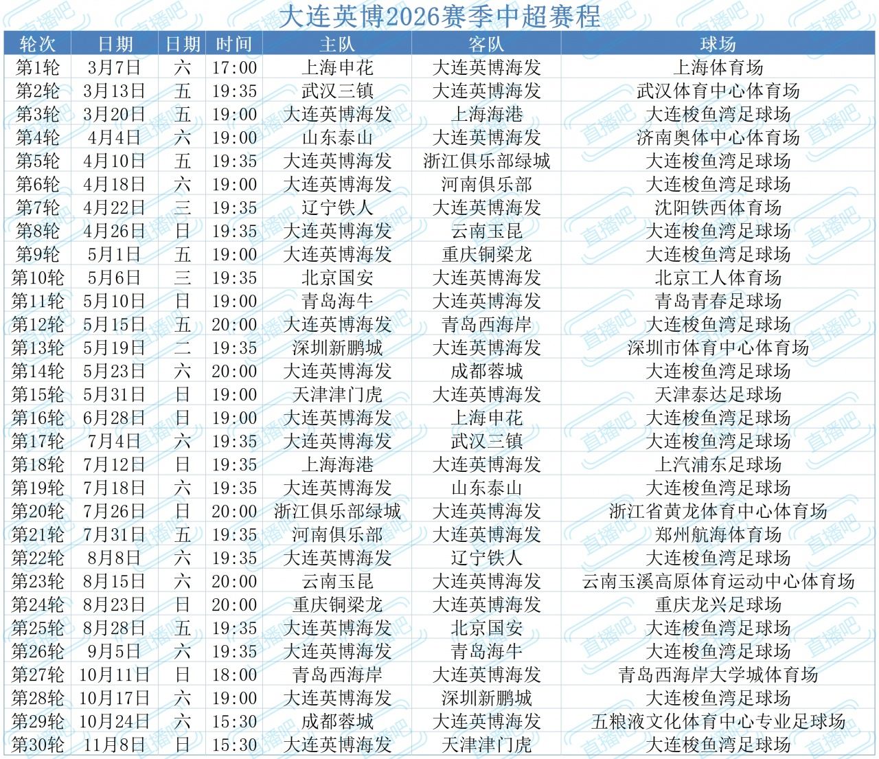 大连英博2026赛季中超赛程
