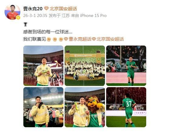 在2026年“超级杯”的比赛中,北京国安2-0战胜上海海港,成功夺得冠军。比赛结束后,曹永竞更新微博庆祝夺冠,并表示“感谢到场的每一位球迷…我们联赛见”。