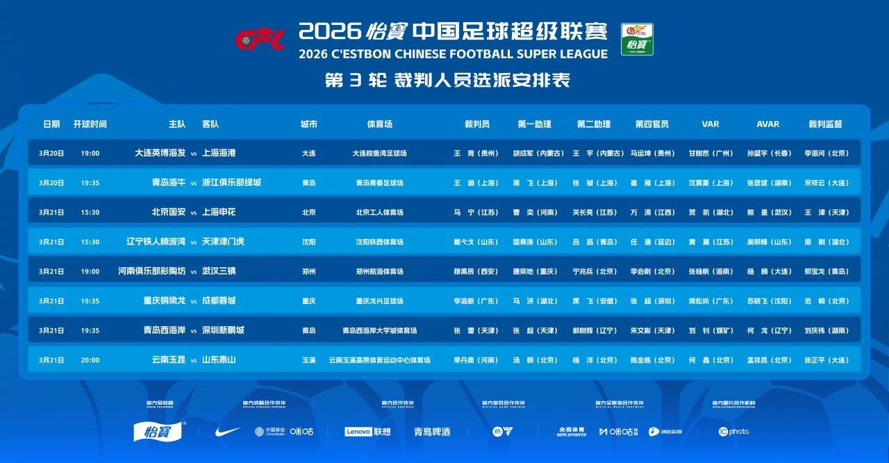 中超第3轮裁判安排公布,本轮中超裁判无麦麦提江和唐顺齐。