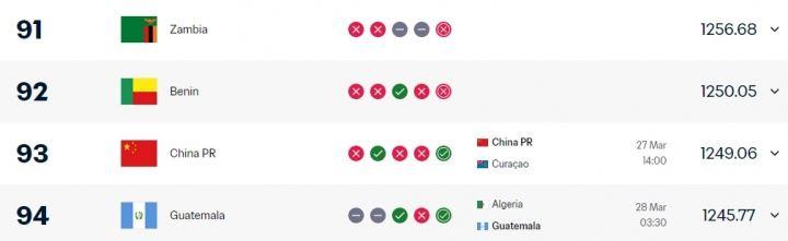 而阿根廷的新对手在FIFA排名上同样也与国足非常接近。赞比亚目前FIFA排名第91,仅高出第93的国足两位。无缘对阵阿根廷的危地马拉则是排名第94,正好比国足低一位。