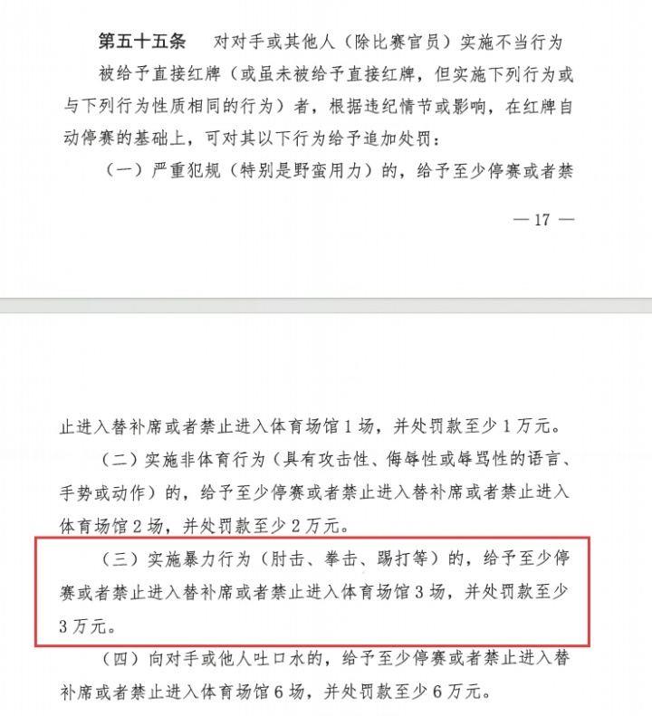 对照现行《中国足球职业联赛联合会纪律与道德准则》第五十五条罚则内容,“实施暴力行为的,给予至少停赛或者禁止进入替补席或者禁止进入体育场(馆)3场,并处罚款至少3万元。”