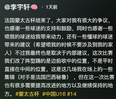 李宇轩写道:法国蒙太古杯结束了,大家对我有很大的争议,也感谢一些球迷的支持和鼓励,同时也感谢一些喷我的球迷给我带来动力,还有一些懂球的球迷带来的建议(希望喷我的时候不要涉及到我的家人)不过我最终也是取决于内部建议,这次比赛我们改了阵型踢的是边前收中的位置,不是平时直接在中间的位置,这是这几场我在场上的一些集锦(对手是法国巴西秘鲁) ,但在这一次比赛也有很多需要提高改进的地方以及继续保持的地方。
