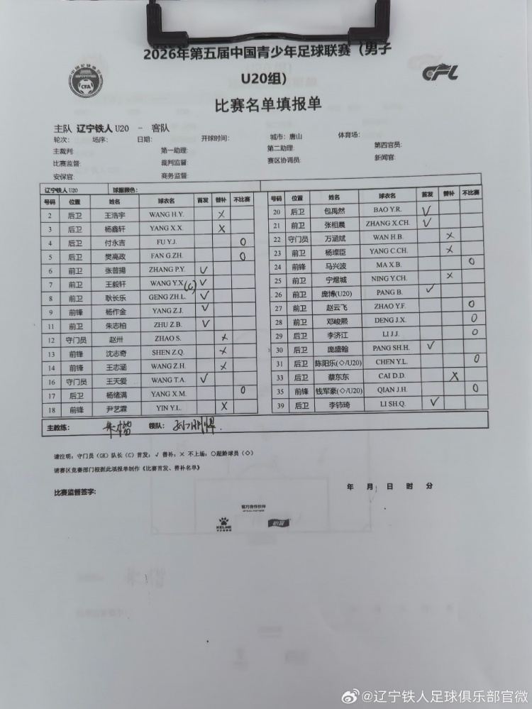 4月29日,2026第五届中国青少年足球联赛男子U20组辽宁铁人U20代表队迎来本组第三轮的较量,对手为天津棣华津英U20队。