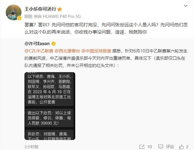 在博主“许可Eason”发布淄博齐盛队内处罚图后,淄博齐盛球员王小乐出面辟谣,并大骂总经理和博主。
