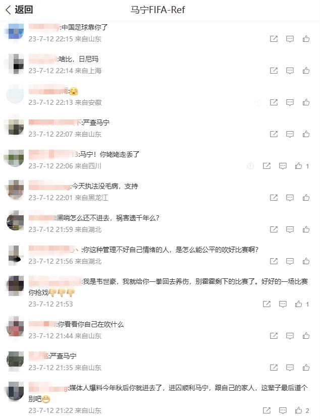 赛后,马宁微博被冲,非常多的网友在马宁最新发的一条微博下谩骂马宁。也有小部分网友说马宁吹罚没有问题。