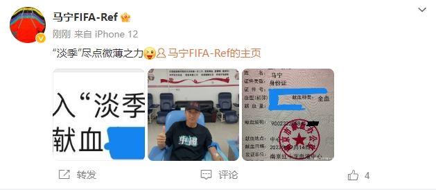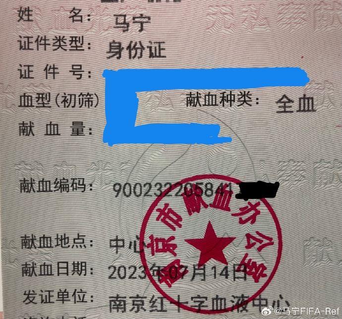 马宁更新了个人微博,晒出前往南京红十字血液中心进行献血的照片。