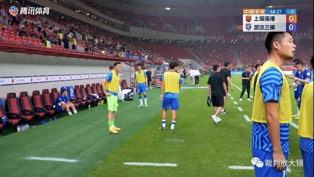 所以,在任航被罚下时,三镇队员都围堵裁判表示不满,但是就这个判罚,小编觉着也没问题,任航罚令出场后,并没有直接走向休息室或看台,而是回到了替补席,我们知道这也是规则不允许的,如果是短暂停留无可厚非,不过从直播来看,任航一直在替补席坐到中场休息(也就三四分钟),这点第四官员没有管理好!