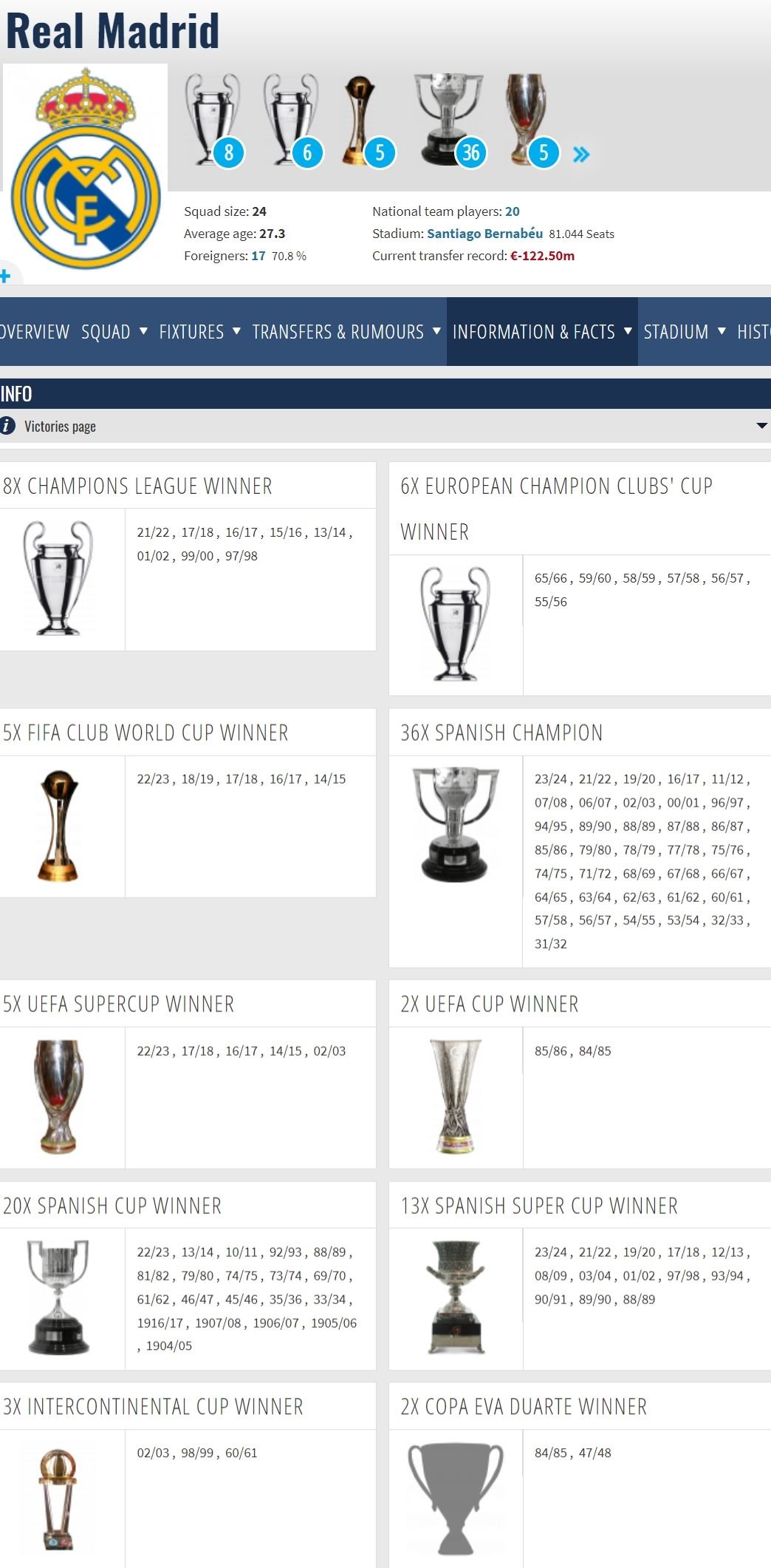 根据德转数据,皇马西甲第36冠是俱乐部第100座冠军奖杯。小俱乐部100座冠军 20世纪最佳俱乐部!