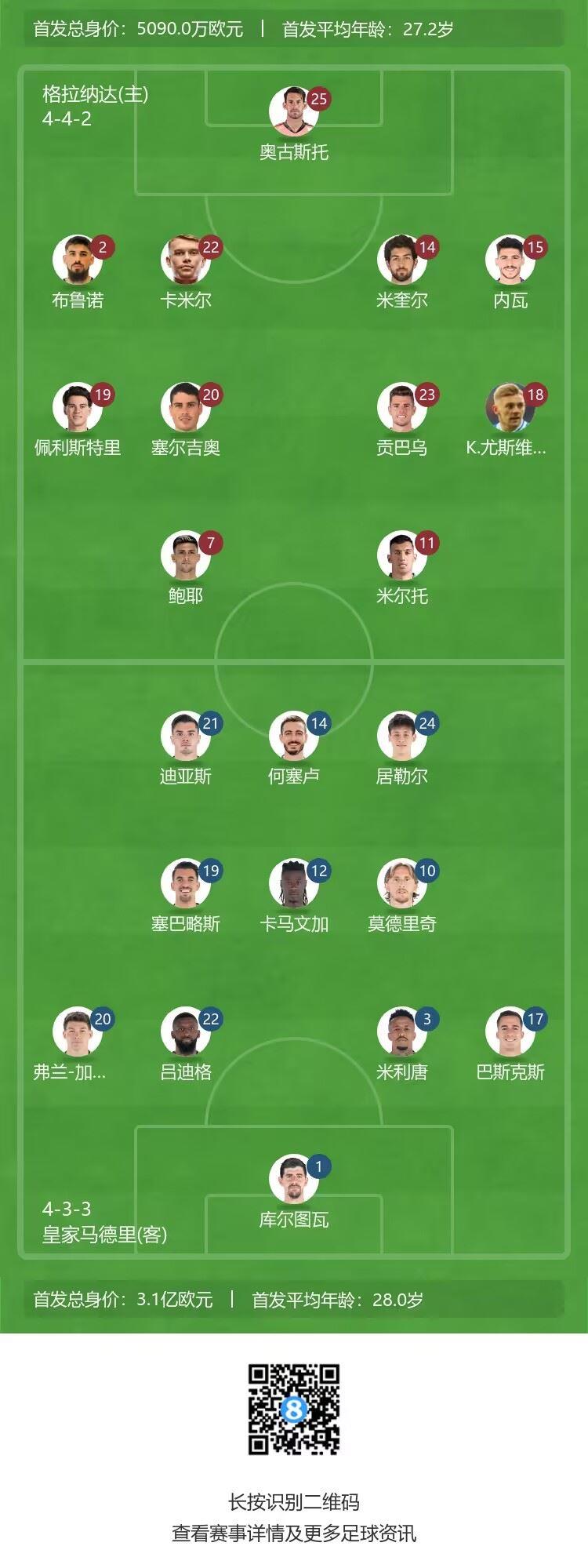 北京时间12日凌晨0:30,西甲第35轮,皇马客场对阵格拉纳达,皇马率先公布了首发阵容。