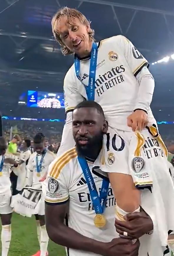 赛后吕迪格扛起莫德里奇,不断的喊:six(六冠)、six……