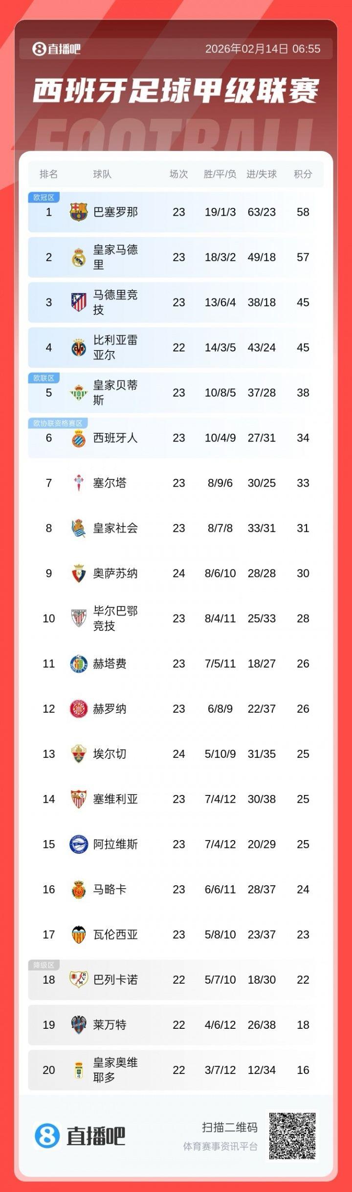 西甲争冠最为胶着,巴萨目前只领先皇马1分。