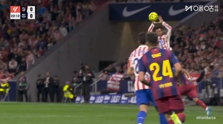 本轮西甲,巴萨2-1马竞。上半场阶段,尼古拉斯·冈萨雷斯退防过程中直接跳起来用手拦截了阿劳霍传出的过顶球,被主裁处以黄牌警告。