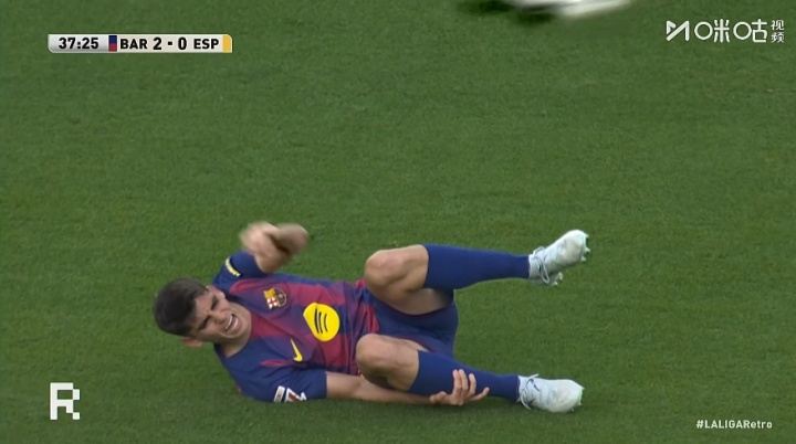 比赛第37分钟,西班牙人的一次进攻,巴萨中卫马丁突然痛苦倒地。但随后他在队医的处理后看起来问题不大,回到了比赛。